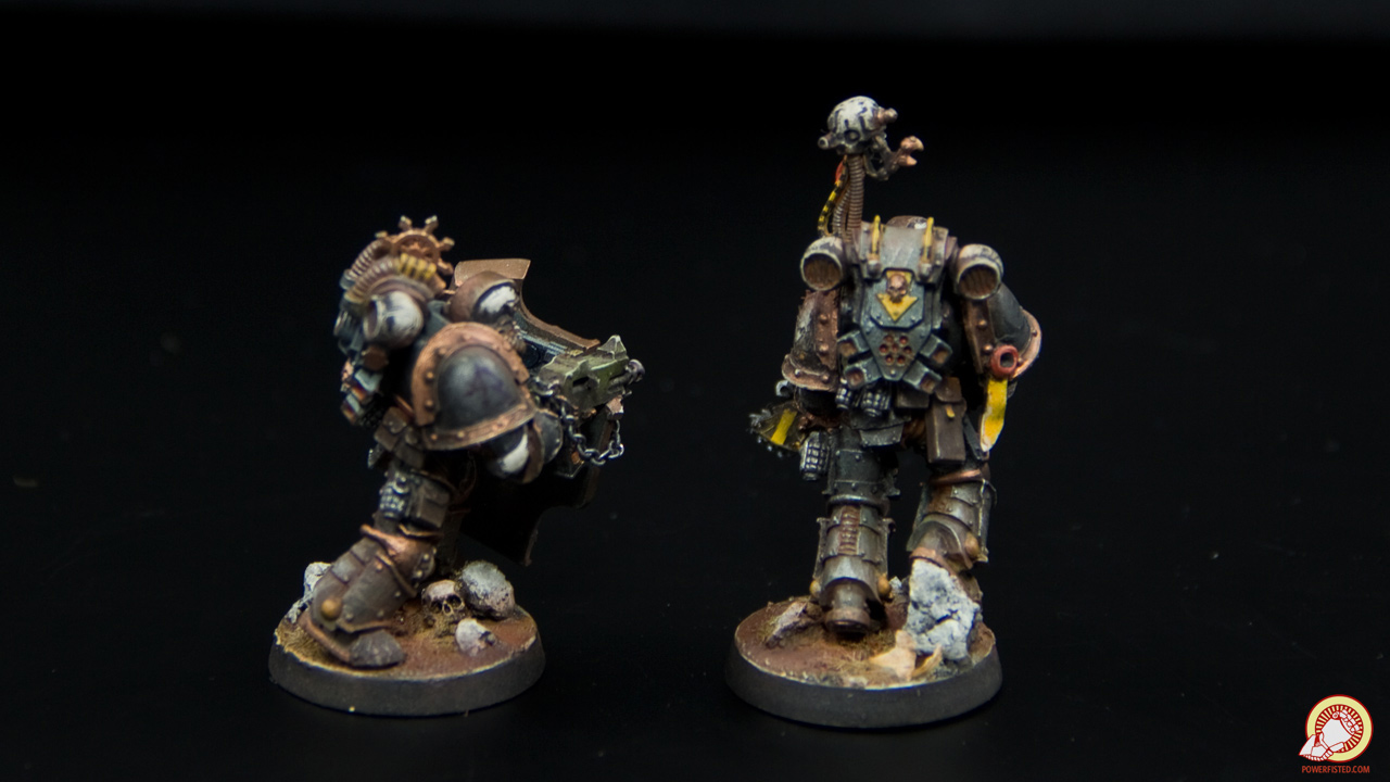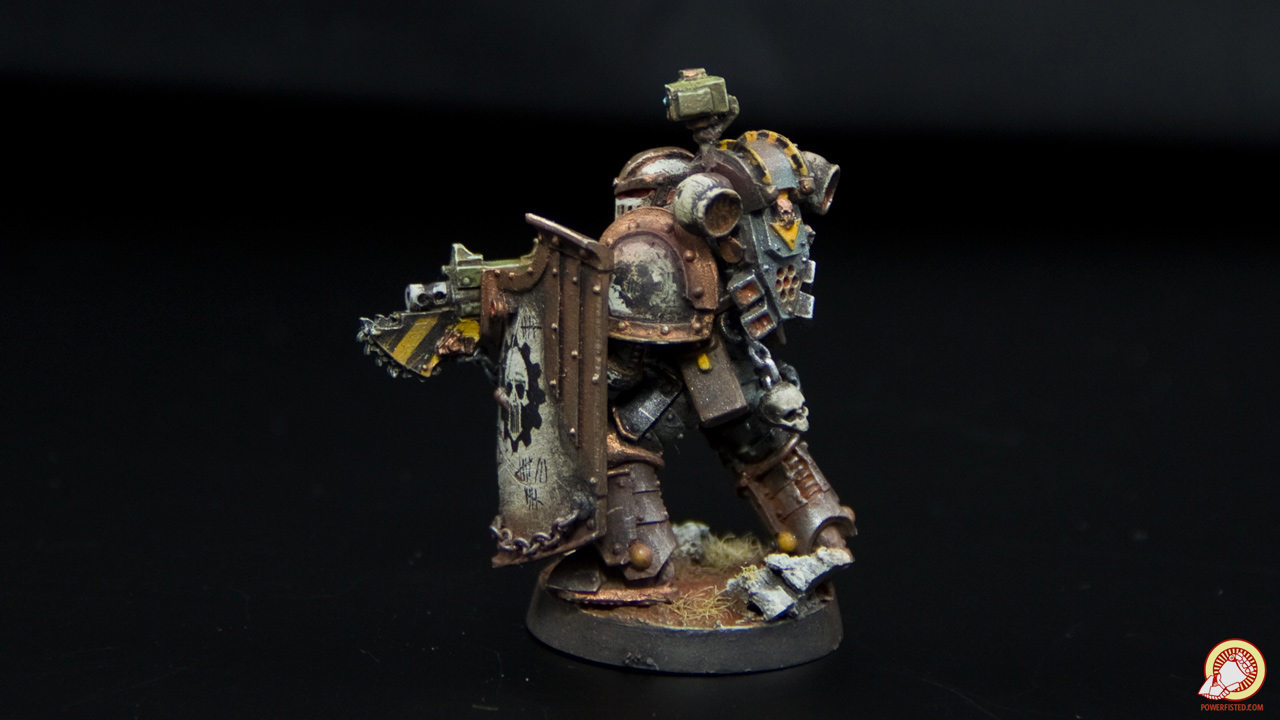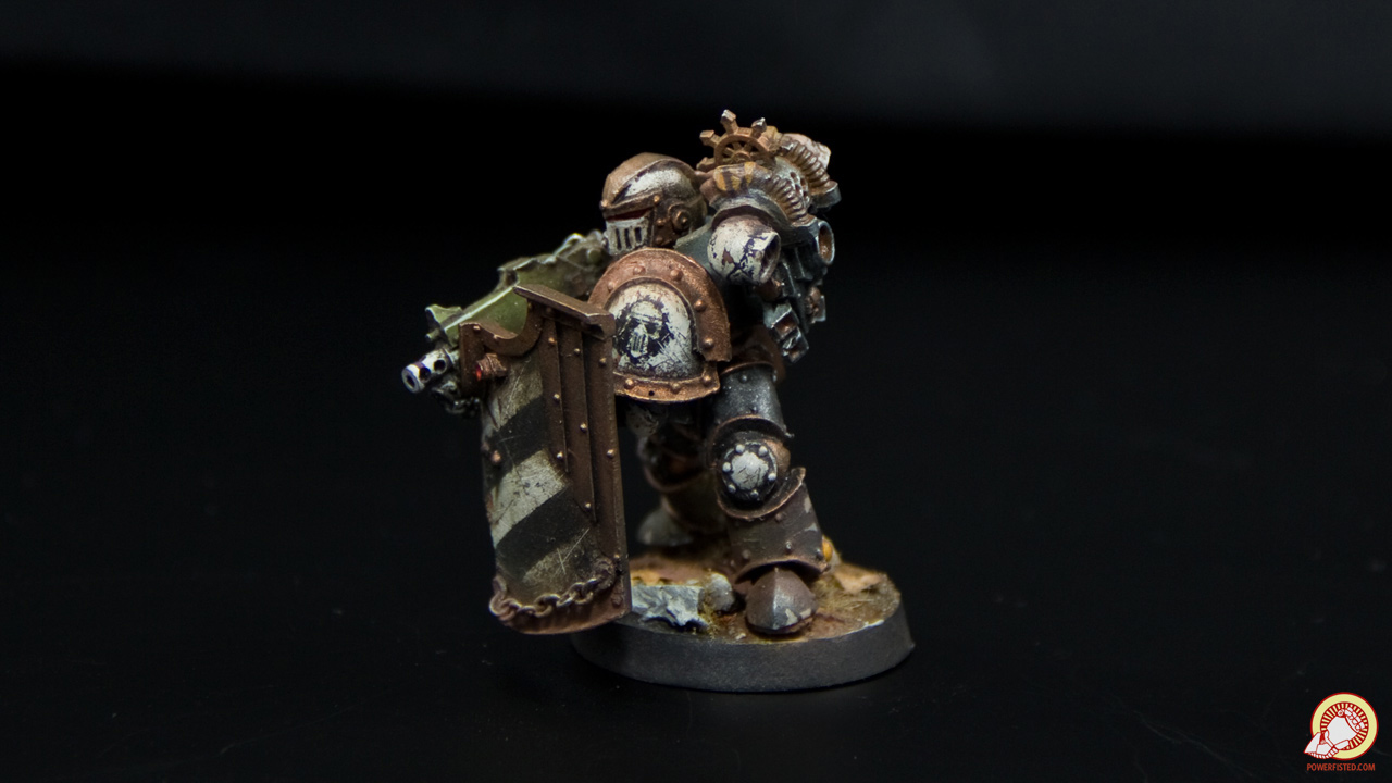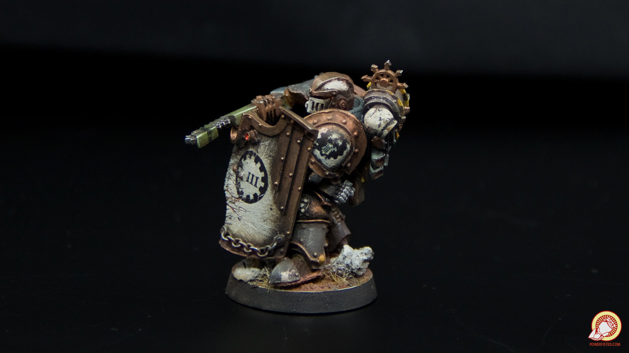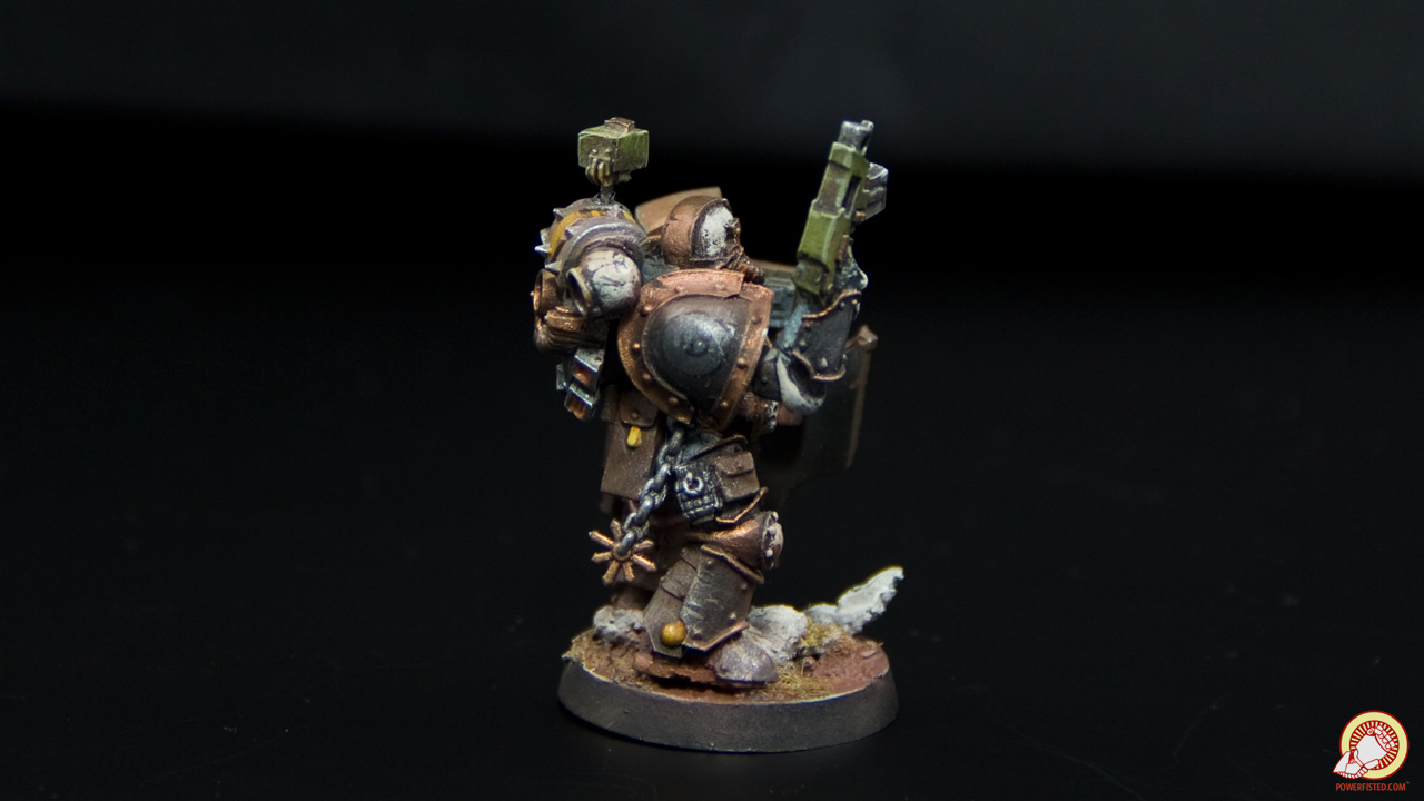 I tried a few new techniques such as waiting a day or longer before removing oil washes from the armor. This made it much more ‘chunky’ and was a painful process, but yielded pretty interesting results. I like how it eroded away my decals. As the HH books release newer and newer Iron Warrior HH fluff, I find my legion choice less and less appealing. Having these legionaries not care about their legion markings at all helps reinforce that they care just as little about their own Primarch as they do the chaos gods or emperor. Down the road I think I might even do a sergeant or two with “Iron” or “Perturabo” crossed out from his shield.